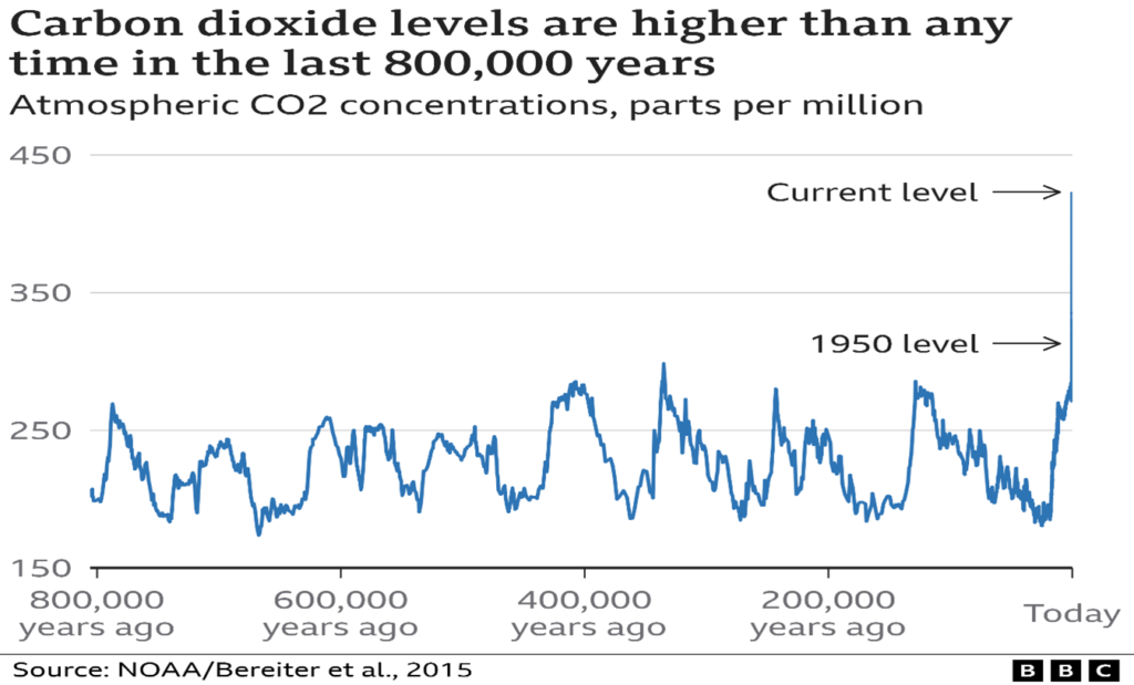 Kể từ khi Cách mạng Công nghiệp bắt đầu – thời điểm con người bắt đầu đốt một lượng lớn nhiên liệu hóa thạch – lượng CO2 trong khí quyển đã tăng khoảng 50%. CO2 được giải phóng từ việc đốt nhiên liệu hóa thạch có dấu vân tay hóa học đặc biệt, khác với CO2 từ các nguồn tự nhiên.