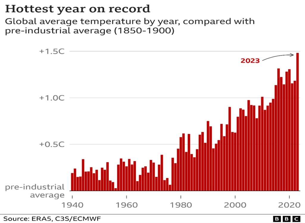 Điều đáng lo ngại là tình trạng nóng lên toàn cầu đã vượt qua mức quan trọng. Nhiệt độ trung bình toàn cầu trong khoảng thời gian 12 tháng từ tháng 2 năm 2023 đến tháng 1 năm 2024 đã cao hơn 1,5°C so với mức nền của cuối thế kỷ 19. Con số này được ghi nhận sau khi năm 2023 được tuyên bố là năm nóng nhất từng được ghi nhận.