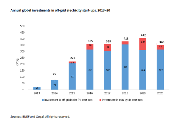 Xây dựng các cơ sở năng lượng mặt trời ngoài lưới có thể mở rộng khả năng tiếp cận năng lượng sạch. Tại Nigeria, một thị trường ngoài lưới lớn đã phát triển do các vấn đề về độ tin cậy của điện. Thị trường này hiện cung cấp 80% nhu cầu năng lượng của quốc gia. Nigeria đặt mục tiêu phát triển 13GW điện mặt trời ngoài lưới vào năm 2030. Các quốc gia khác cũng sẽ theo sau. Chương trình ESMAP dự đoán gần nửa tỷ người sẽ sử dụng điện từ lưới điện nhỏ vào năm 2030.