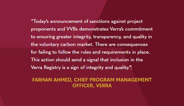 “Thông báo hôm nay về các biện pháp trừng phạt đối với những người đề xuất dự án và các tổ chức xác nhận/kiểm chứng thể hiện cam kết của Verra trong việc đảm bảo tính toàn vẹn, minh bạch và chất lượng cao hơn trong thị trường carbon tự nguyện. Việc không tuân thủ các quy định sẽ phải đối mặt với hậu quả nghiêm trọng. Điều này khẳng định rằng việc được bao gồm trong Verra Registry là một dấu hiệu của tính toàn vẹn và chất lượng.” Farhan Ahmed, Giám đốc Quản lý Chương trình Cấp cao của VERRA tuyên bố.