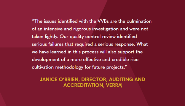 Verra, tổ chức phi lợi nhuận hàng đầu về tiêu chuẩn cho thị trường carbon tự nguyện, đã công bố việc từ chối 37 dự án trồng lúa ở Trung Quốc và lần đầu tiên áp dụng các biện pháp trừng phạt chưa từng có đối với các bên đề xuất dự án và các tổ chức xác nhận/kiểm chứng (VVBs – validation/verification bodies) liên quan đến các dự án này. Quyết định này là kết quả của quá trình kiểm soát chất lượng nghiêm ngặt của Verra, theo Mục 6 của Quy trình Đăng ký và Phát hành Tiêu chuẩn Verified Carbon Standard (VCS) và Chương trình Giám sát Hiệu suất VVB mới của tổ chức.